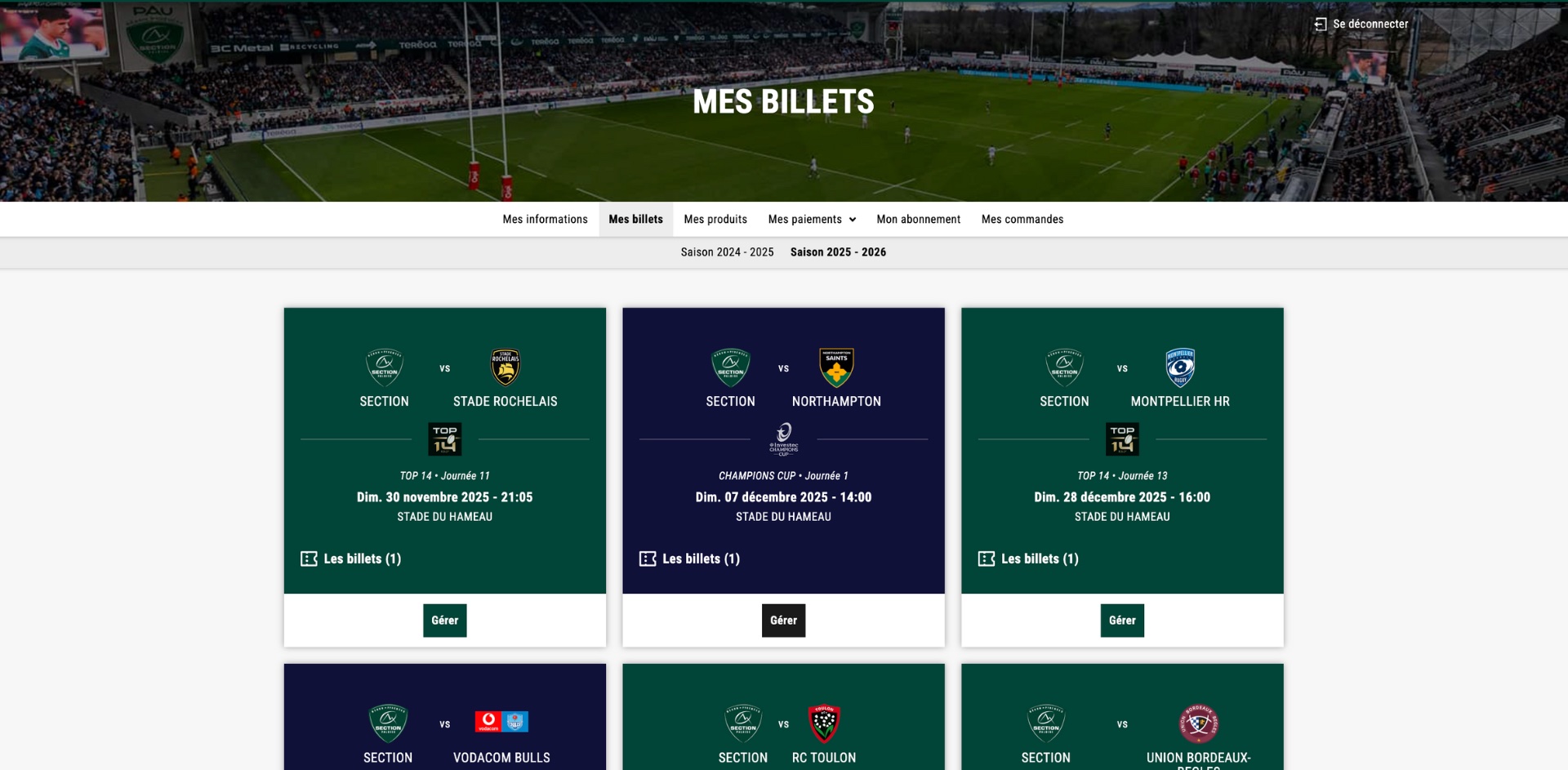· Abonnement -12 ans et 12-25 ans, le prêt d’abonnement n’est possible qu’à une personne de la même catégorie d'âge. Si ce n’est pas le cas, veuillez contacter le service billetterie à billetterie@section-paloise.com