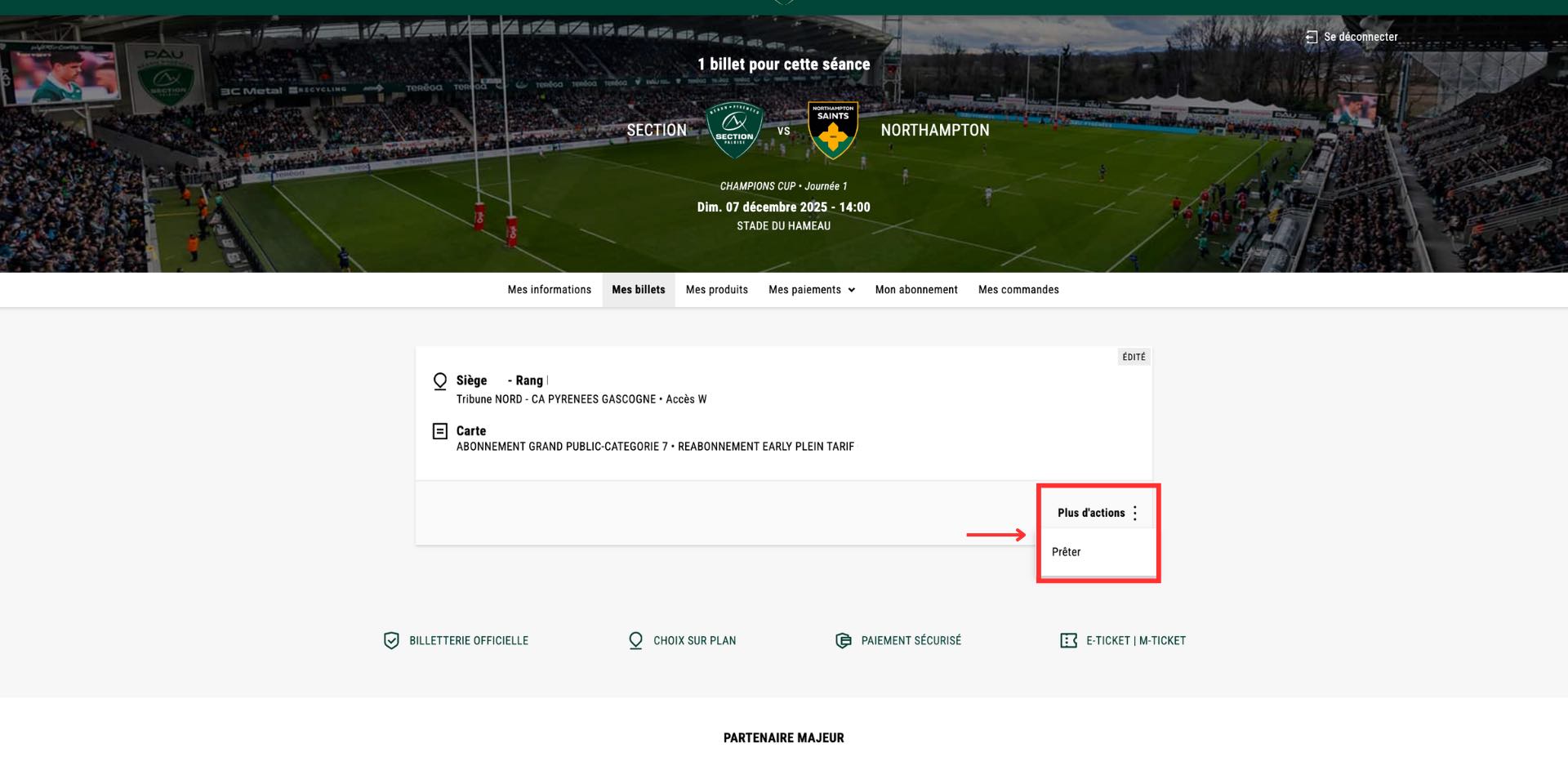 ÉTAPE 5 : UNE FOIS LA RENCONTRE SÉLECTIONNÉE, CLIQUEZ SUR "PLUS D'ACTIONS" ET "PRÊTER MON ABONNEMENT"