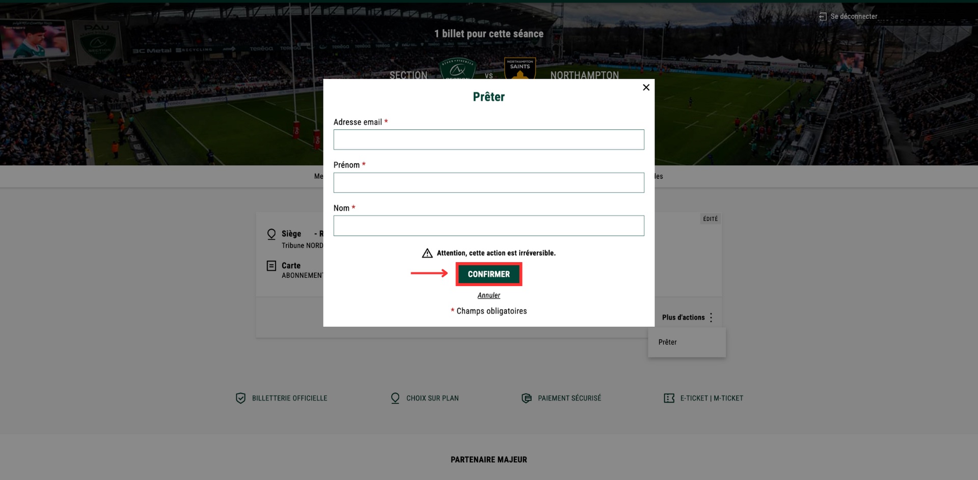 Pour confirmer le prêt, un mail vous sera envoyé de la part de billetterie@section-paloise.com